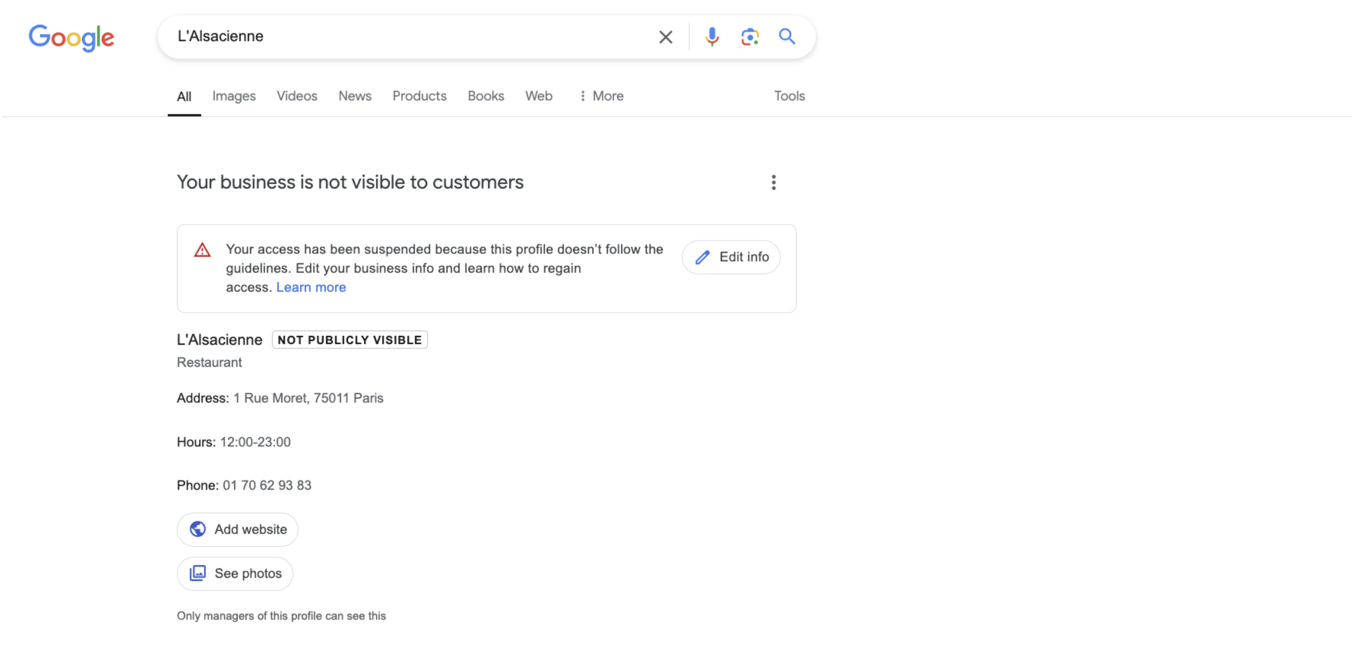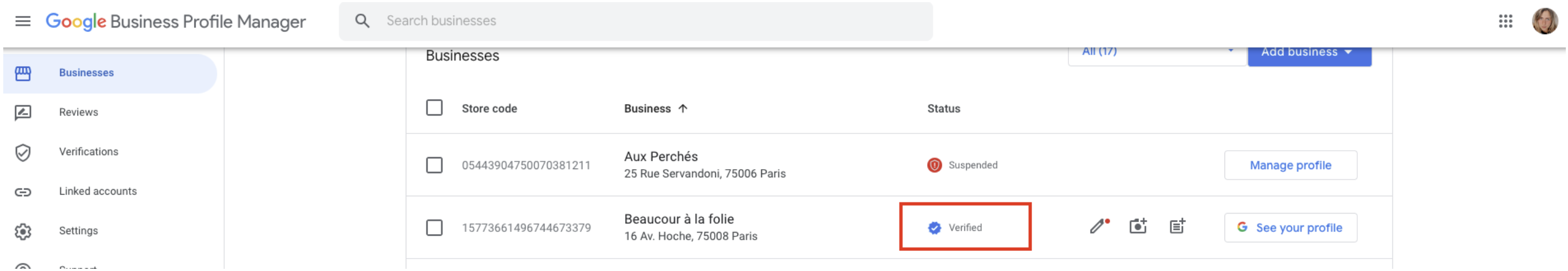 If the Business Page is managed by this account, and it’s verified and live on Google, it will appear like this: